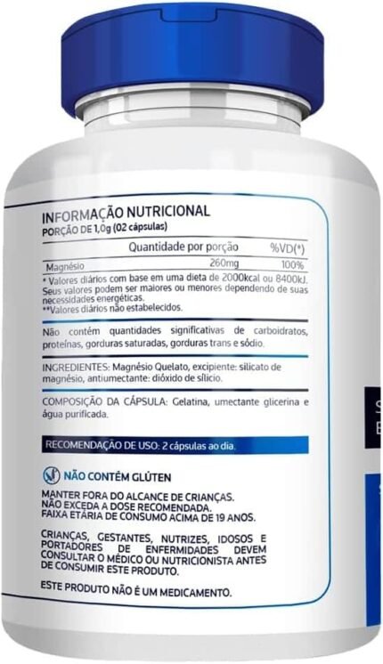Ingredientes Bisglicinato de magnésio (magnésio), L-treonina, carbonato de cálcio, celulose microcristalina, estearato de magnésio e dióxido de silício. Cápsula: