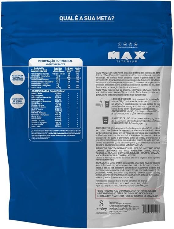 | Nome do produto | 100% Whey Refil (900g) – Cookies and Cream – Max Titanium |