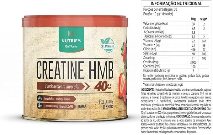 Hidroximetilbutirato de cálcio, creatina monohidratada, polpa de frutas vermelhas, concentrado de rabanete e cenoura, coenzima Q10, mix de vitaminas e minerais ( bisglicinato de zinco, levedura enriquecida com selênio, menaquinona-7 e colecalciferol), aromatizantes, acidulante ácido cítrico, edulcorante glicosídeos de esteviol de Stevia rebaudiana Bertoni e regulador deacidez ácido málico (DL-).