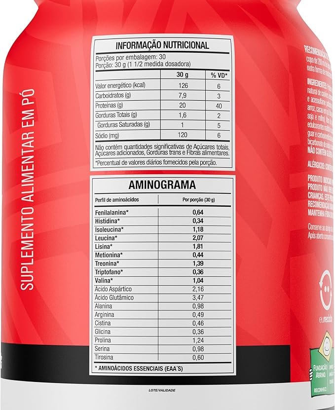 Proteina de soro do leitye concentrada, espessante goma guar e goma xantana, edulcorantes sucralose e acessulfame potássico, cacau em pó e aromatizante idêntico ao natural de doce de leite e corante caramelo IV