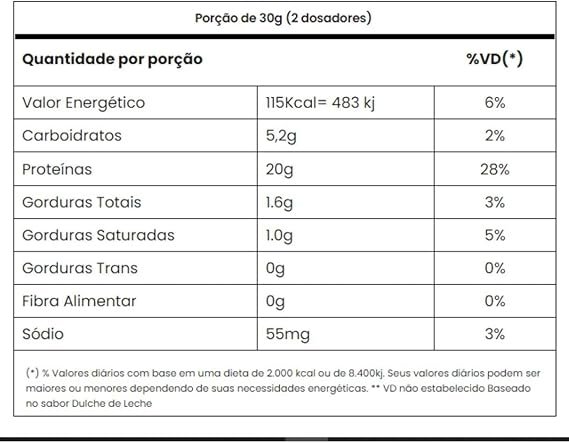 100% Proteína concentrada do soro do leite, aroma idêntico ao natural de baunilha, goma xantana, educorantes acessulfame de potássio e sucralose.