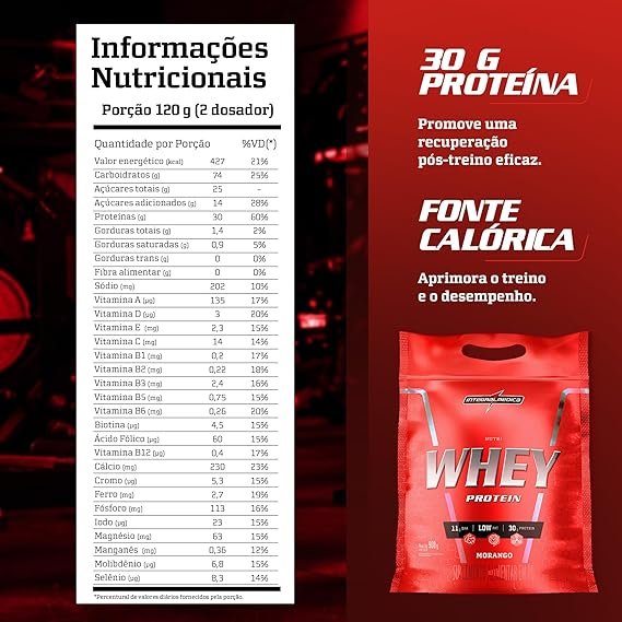 Nome do produto Nutriwhey Morango Pouch 907G Informações sobre alergia Não contém bacalhau, Não contém glúten Volume 946 Mililitros Unidades 900.0 grama(s) Marca Integralmedica Formato Pó Descrição da faixa etária Adulto Número de unidades 1 Tamanho 907 g (Pacote de 1) Fabricante Integralmédica Número do modelo 7896311709496 Dimensões do produto 17 x 8 x 3,3 cm; 910 g ASIN B07MBGY443 Funciona a bateria ou pilha? Não EAN 7896311709496 - Dimensões do produto : 17 x 8 x 3,3 cm; 910 g