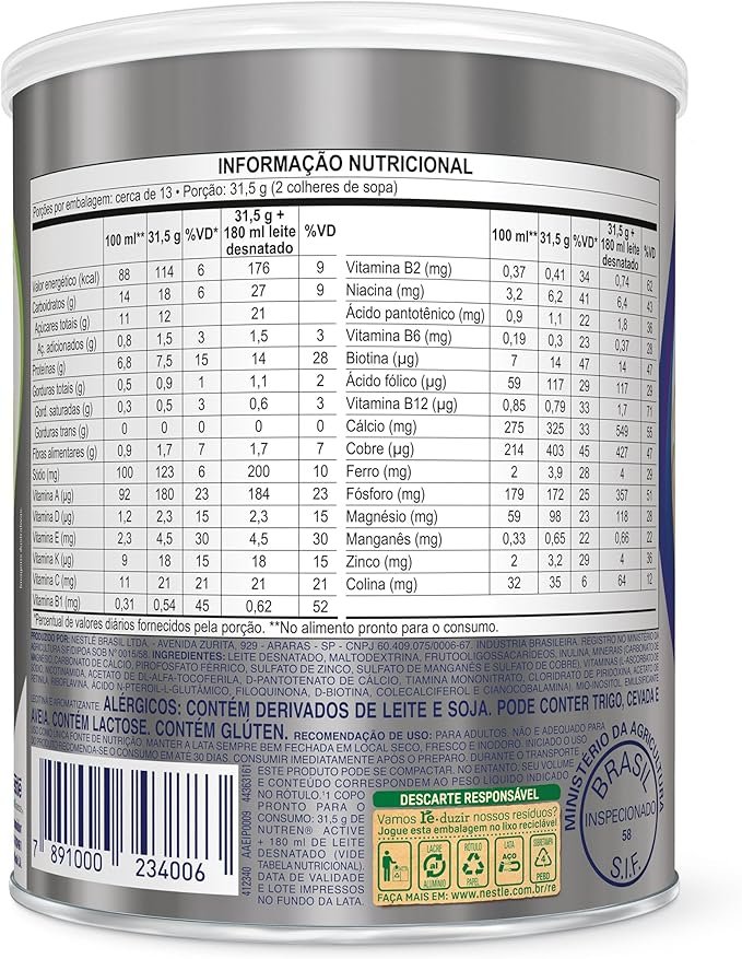 Ingredientes ‎Composto lácteo com maltodextrina (leite desnatado, frutooligossacarídeos, inulina, minerais (carbonato de magnésio, carbonato de cálcio, pirofosfato férrico, sulfato de zinco, sulfato de manganês e sulfato de cobre), maltodextrina (0,5%), vitaminas (L-ascorbato de sódio, mio-inositol, nicotinamida, acetato de DL-alfa-tocoferila, D-pantotenato de cálcio, tiamina mononitrato, cloridrato de piridoxina, acetato de retinila, riboflavina, ácido N pteroil-L-glutâmico, filoquinona, D-biotina, colecalciferol e cianocobalamina) e emulsificante lecitina de soja), maltodextrina e aromatizante. ESTE PRODUTO NÃO É LEITE EM PÓ.