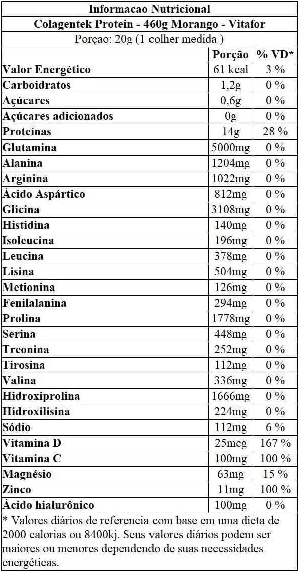 Colágeno hidrolisado, L-glutamina, bisglicinato de magnésio (magnésio), hialuronato de sódio obtido pela fermentação de Streptococcus zoopidemicus, ácido ascórbico (vitamina C), bisglicinato de zinco (zinco), colecalciferol (vitamina D3), aroma idêntico ao natural, acidulante ácido cítrico, antiumectante dióxido de silício, espessante goma xantana, corante carmin e edulcorantes glicosídeos de esteviol (estévia) e taumatina.